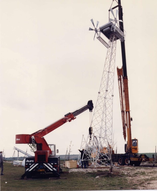 Fast forwarding to 1990, the Windharvester was installed. This 45kW turbine featured a 17m rotor diameter, three blades and a 15m high tower. It was designed for high wind speed locations – a similar machine provided power on Fair Isle in the Shetlands for many years. The turbine was refurbished in 2000-2001 and raised again in July 2002. In October 2016, the Windharvester was lowered for a final time to make room for two new ISIS buildings on site. While the turbine generated 549,305 kWh over 23 years, it had spent a significant amount of time being instrumented during various research campaigns. In its later years, the Windharvester's role was solely to generate power into the RAL grid and to be a large exhibit for Public Engagement purposes. It was lovingly maintained for many years by Technology Department staff members Peter Anthony and Alan Ruddell.